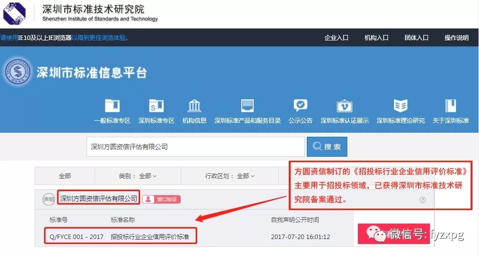 方圓資信自主制定的“招投標行業企業信用評價標準”(標準號:Q/FY CE001-2017)已獲得深圳市標準技術研究院備案通過,是受行業認可的評價標準體系。